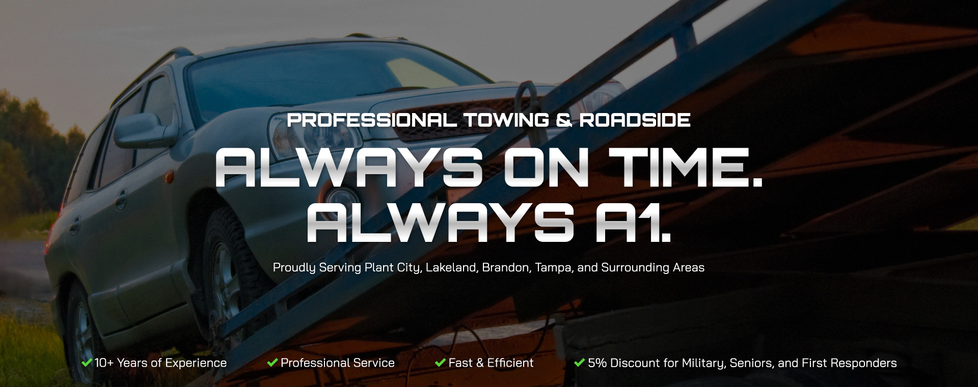 Welcome to A1 Tow Masters, your reliable partner for fast and professional towing and roadside assistance. Whether you need light or medium-duty towing for your vehicle, you’re stranded with a dead battery, or need a tire change, we’ve got you covered. Our team is available to provide quick and efficient roadside services, including lockout assistance, battery jumpstarts, and more, ensuring you’re back on the road in no time. At A1, we prioritize safety, affordability, and customer satisfaction—when you’re in a tough spot, we’re here to help.